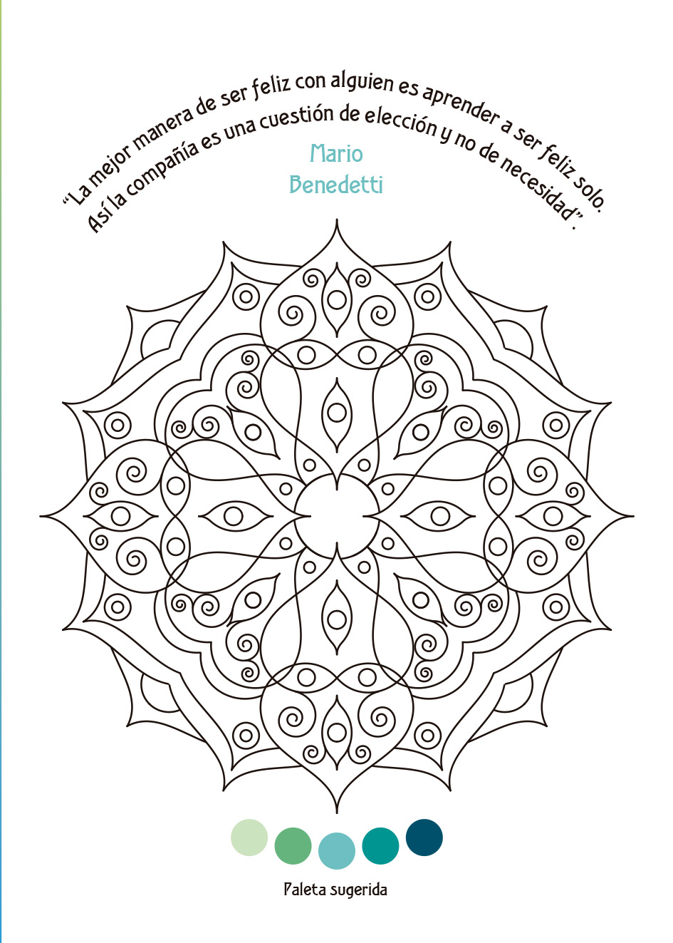 Este libro incluye 16 diseños para colorear, con paletas de color para tener como inspiración y frases para leer y reflexionar mientras le dedicamos un tiempo a relajarnos y disfrutar de la actividad.